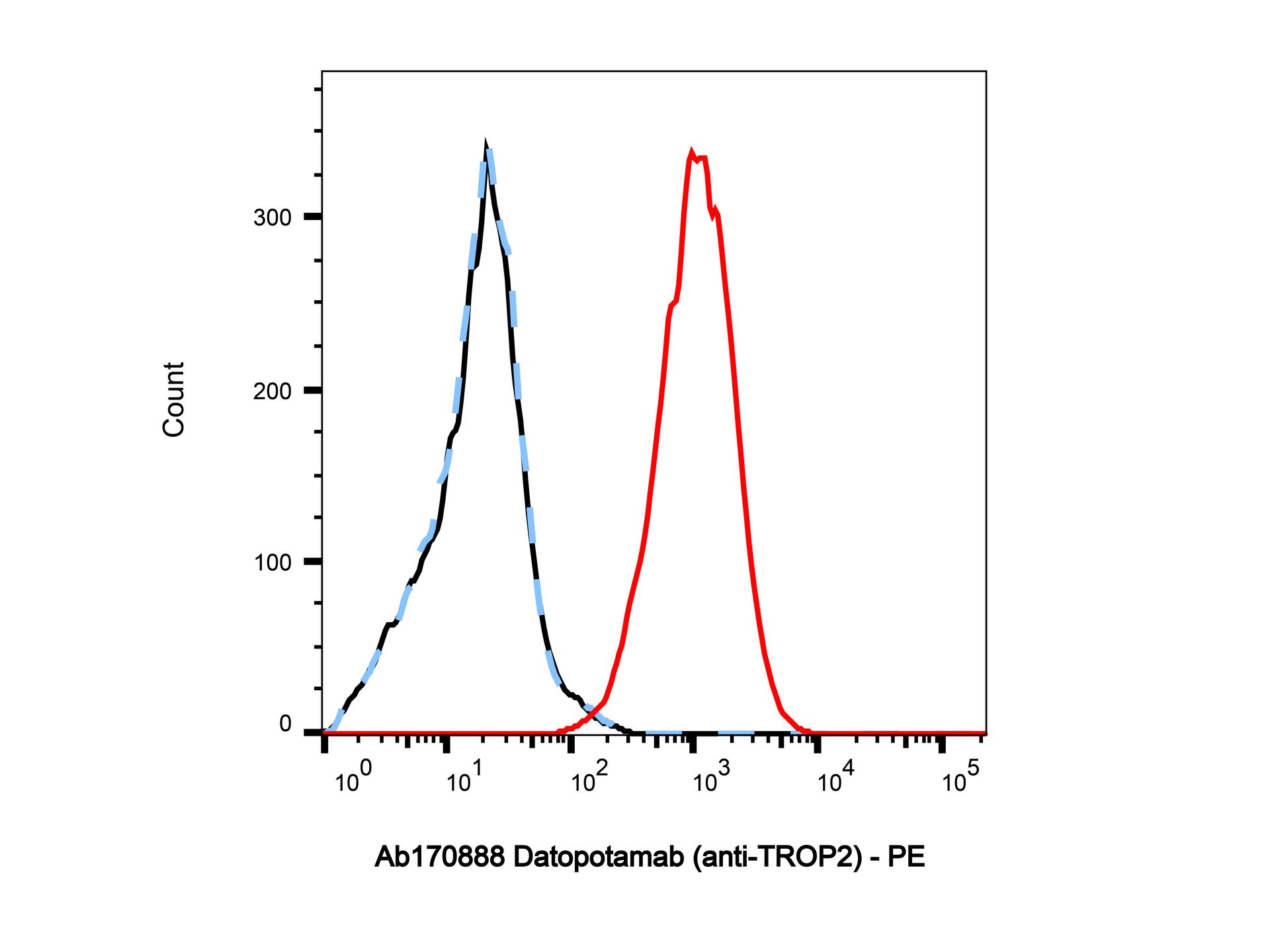 Flow Cytometry analysis of MCF-7 cells labelling TROP2 (red) with Datopotamab (anti-TROP2) (Ab170888). Goat Anti-Human IgG (PE) (Ab175838) at a dilution of 1/1000 was used as the secondary antibody. Blue - Isotype control, human IgG (Ab170213). Black - Unlabelled control, cells without incubation with primary antibody.