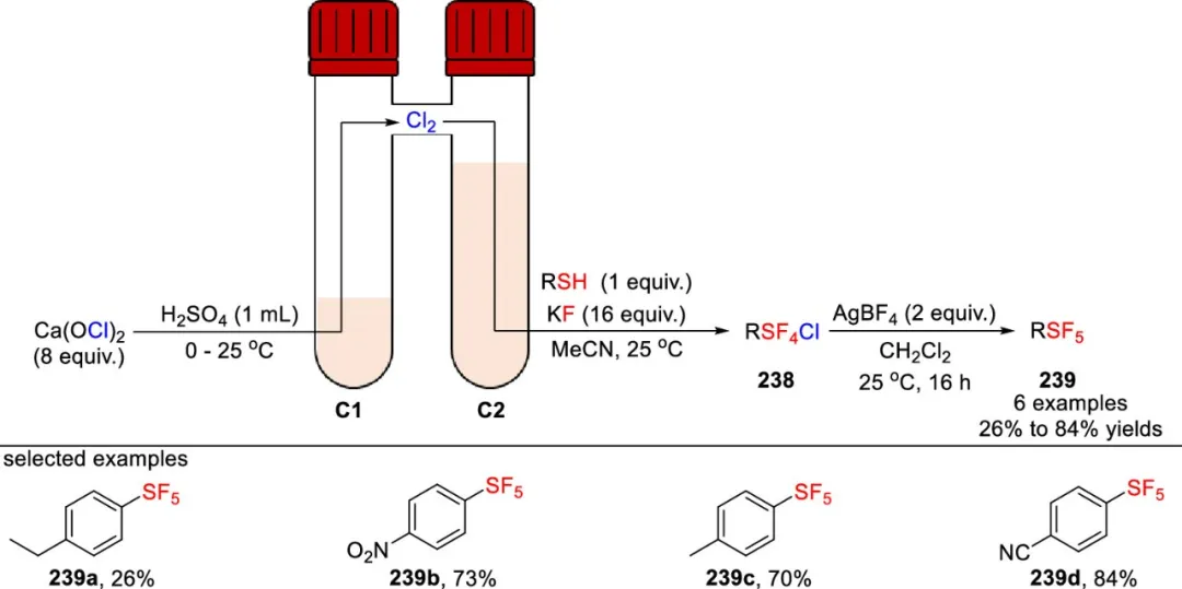 In 2023, the De Borggraeve and Ismalaj teams developed a synthetic route that does not require direct use of chlorine gas. This method uses calcium hypochlorite and sulfuric acid to in situ generate chlorine gas in a CO-ware reactor for the synthesis of chlorotetrafluorothiophenol derivatives 239 (as shown in the figure). The specific process is as follows: chlorine gas generated in the first chamber (C1) of the reactor reacts with thiol and KF in acetonitrile solvent in the second chamber (C2) at room temperature to generate chlorotetrafluorothiophenol 238; subsequently, this intermediate 238 is treated with 2 equivalents of silver tetrafluoroborate in dichloromethane to obtain the corresponding SF₅-containing compound 239.